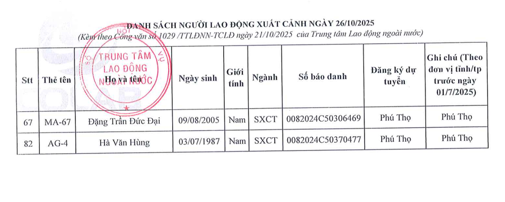Lưu ý: Trường hợp người lao động đã nộp tiền nhưng không xuất cảnh vì các lý do khác nhau, đề nghị đến trụ sở Trung tâm Lao động ngoài nước – số 1 Trịnh Hoài Đức – Ô Chợ Dừa – Hà Nội để nhận lại các khoản tiền đã nộp (nếu có) trong ngày 27/10/2025.